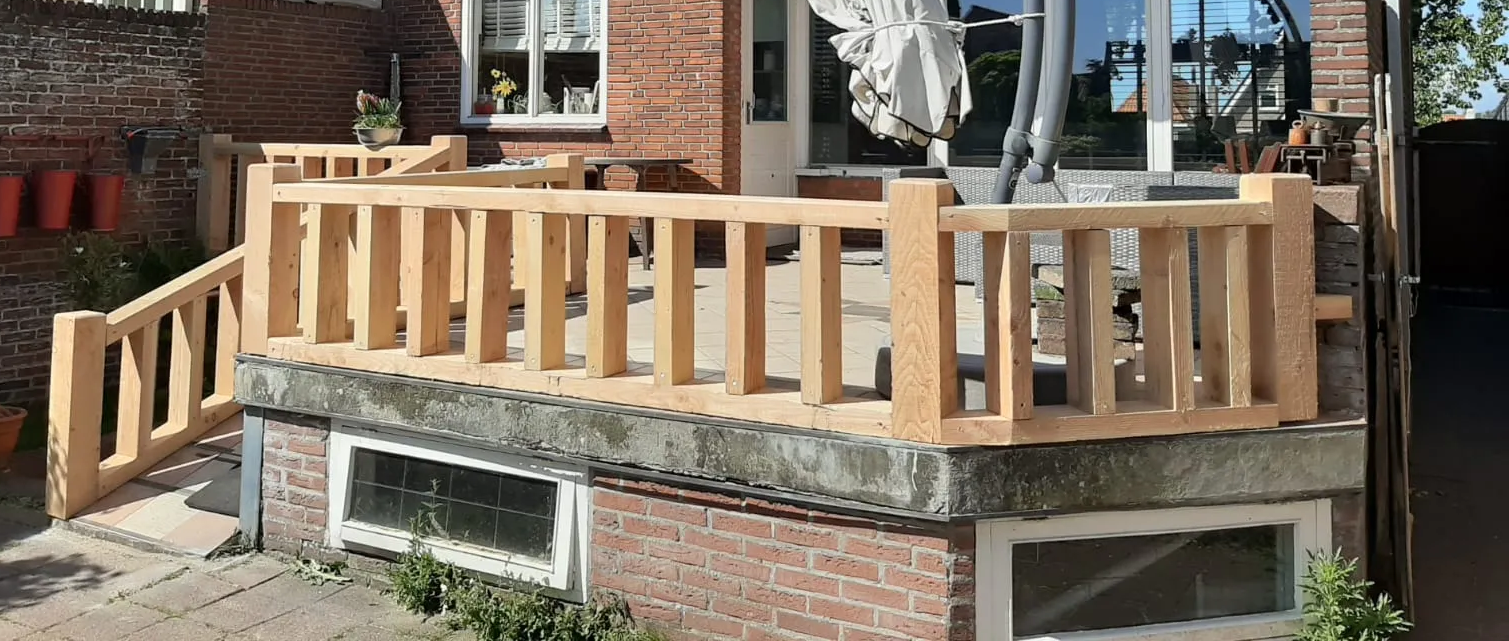 Een robuust hekwerk geplaatst op een bestaand balkon. grof Douglas hout.