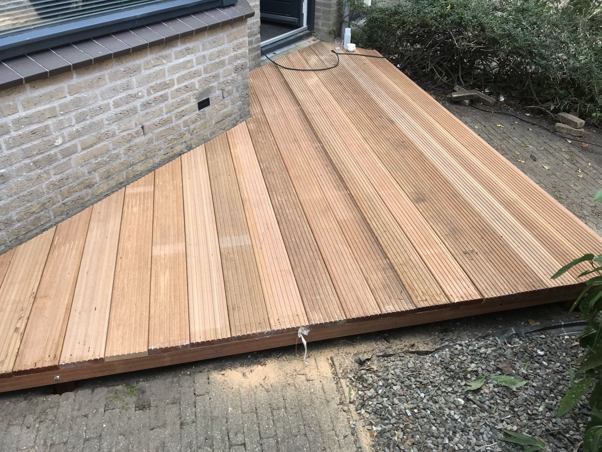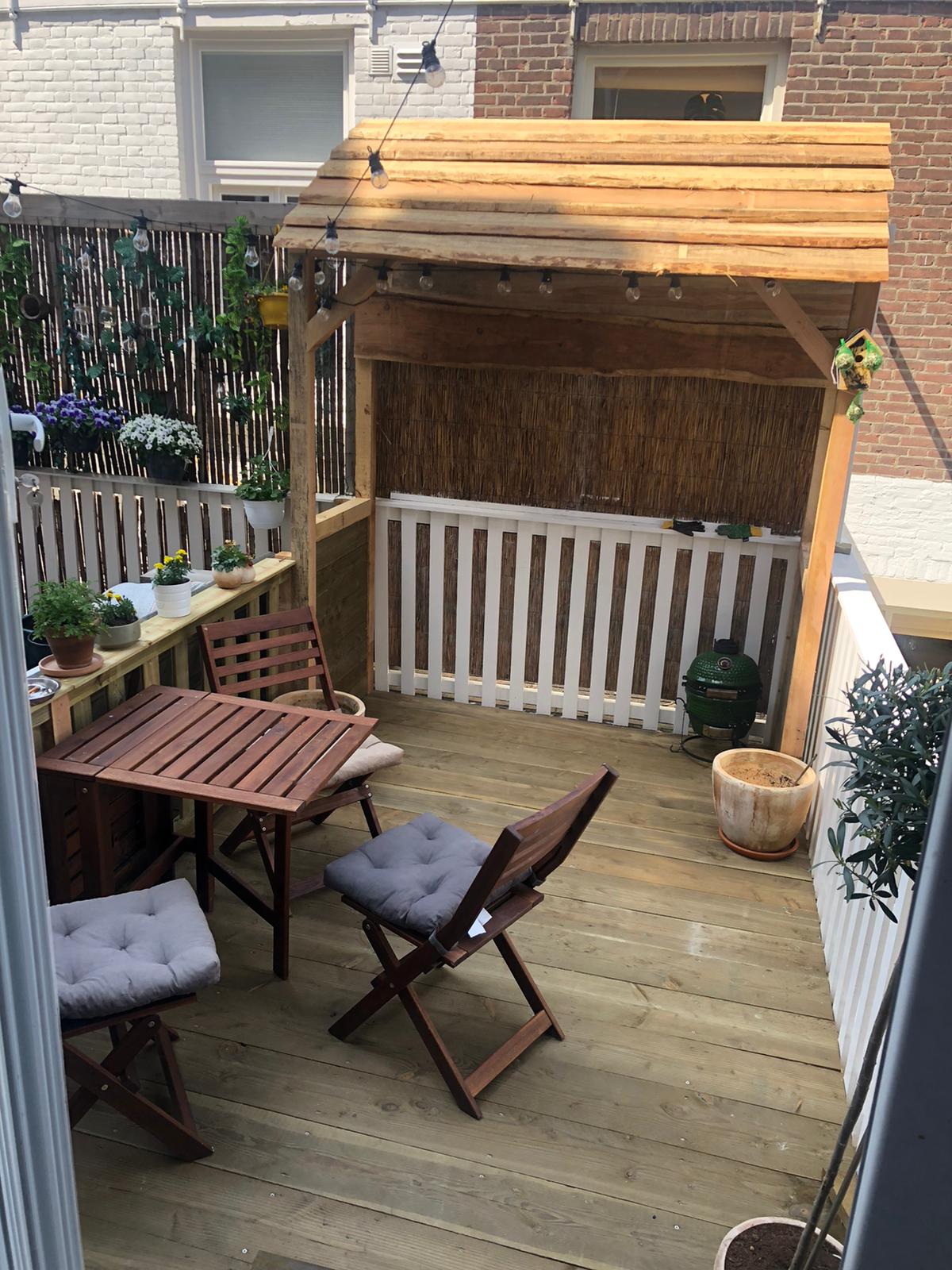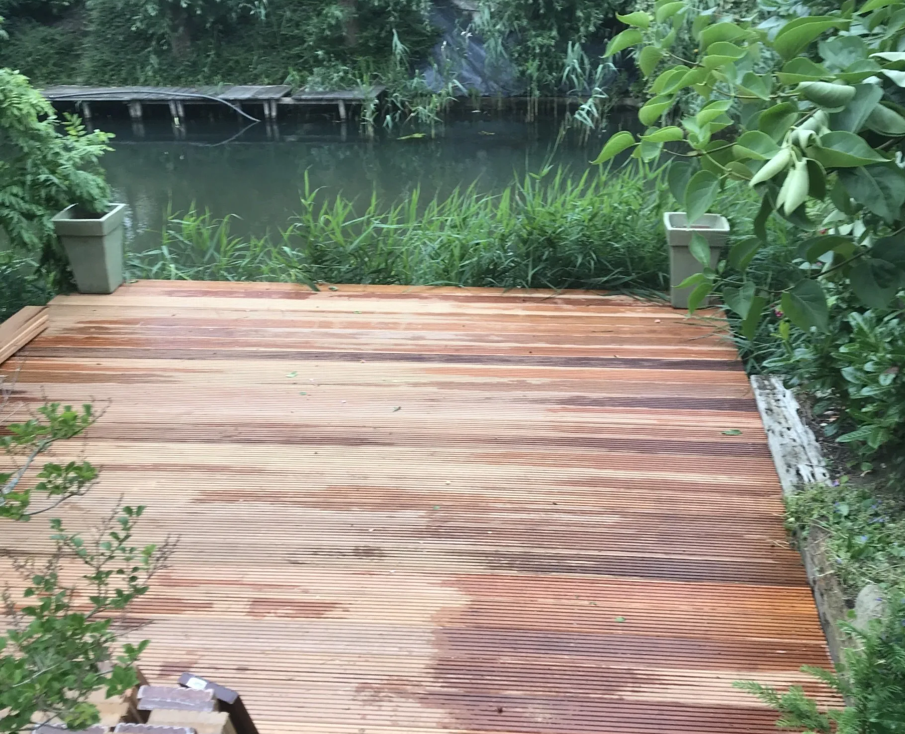 Hier is de bestaande vlonder verwijdert en vervangen door frisse nieuwe planken.